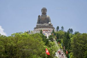 黄金像の向こうに高さ100メートル227段の石段があり さらにその奥には石灰岩で出来た吹き抜けの洞窟と寺院があります。
