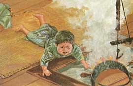 母シカは慌てて家に戻るも部屋の中はもう既に英世の姿はありませんでした。なんと そのとき英世の泣き声は部屋の中央にある火のついた囲炉裏(いろり)の中から聞こえて来ました。