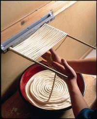そのとき職人の両手に挟まれた紐のような麺は職人に強くこすられる事によって見事なねじれが発生します。