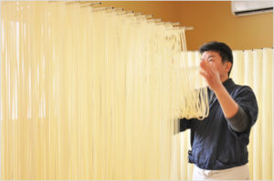 ある程度伸びきった麺の束は天井に吊るし掛けられます。そして職人は〃いい作品を作るには愛情が大切だ〃と言いました。