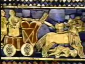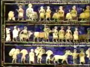 紀元前2600年 横幅50センチくらいの箱 ウル王朝初期の作品 発掘当初はバラバラになっていた ただスタンダードの意味は分かっていたない