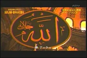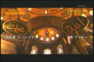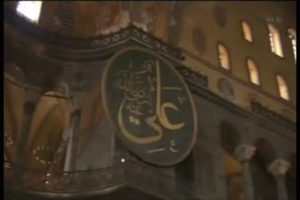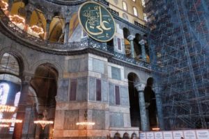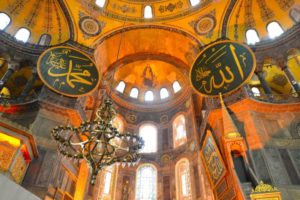 アヤソフィア内に設置された2つの緑の円盤状の看板にはアラビア語で神アッラーと預言者ムハンマドと書かれている。