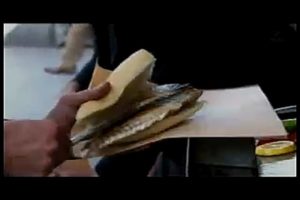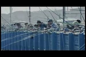 揺れる船の上の鉄板にはサバの切り身がずらりと並べられている