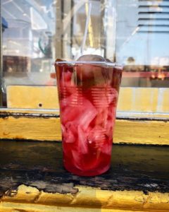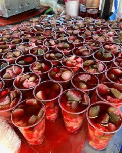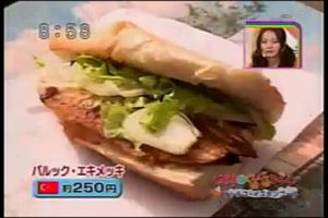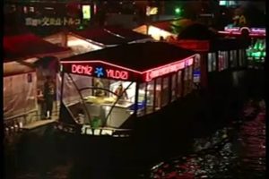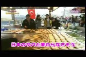 停泊中の揺れる船の中では名物のサバサンドが売られている