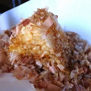 そして焼きあがった おにぎりは紙の包みの中へ入れられ さらに〃これでもか〃と言わんばかりにギッシリとカツオ節を包みの中に詰め込みます。
