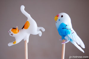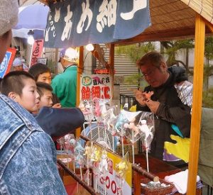 その楽しい音は通りの屋台から流れてました。そしてその屋台には棒に刺された様々な動物の飴が売られてました。その奥ではその飴細工(一個300円)の実演販売をやってました。