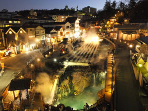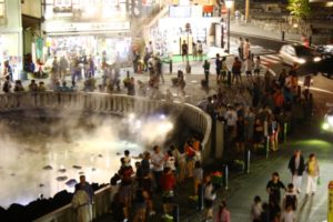 そして夜になっても来客の流れは途切れる事はありませんでした。さらに温泉街に点灯した照明(光)がモクモクと立ち込める湯気に溶け込み幻想的な世界を作り出してました。