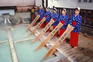 その演技を〃湯もみ〃と言い浴槽の中をかき混ぜる事で温度を下げるだけでなく浴槽に沈殿する温泉成分を満遍なくかき混ぜる効果もあるそうです。