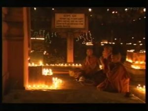 夜 僧侶が遺跡の周りに蝋燭で明かりをともし祈りの儀式を行う