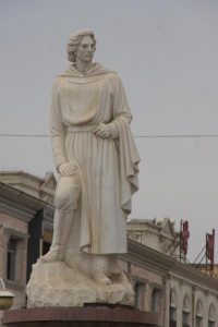 市内にはマルコポーロ像がある 線路を風から守るための砂漠の防風壁(現代版長城)