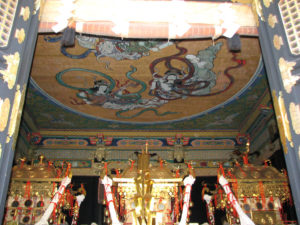 そして神主さんは拍子木を手にし天井の龍に向かって〃龍よ おとなしくせーい〃と言いながらその拍子木を両手でカチン カチンと叩きます。