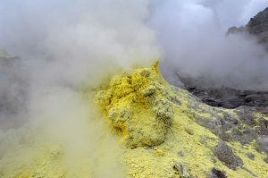 モクモクと有毒ガスが立ち込める硫黄島のその一帯は砂の間から硫黄が噴出し硫黄臭い匂いが漂ってました。そして岩までも黄色く溶けていました。
