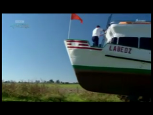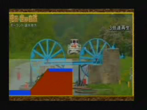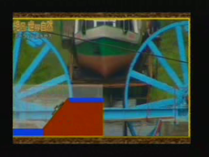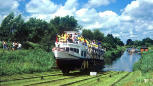 川から陸に上がった船がリフトの力を利用し陸の上を走る