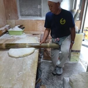 すると あら不思議!竹棒の下に敷かれた麺生地が竹棒にグイグイ押される事により生地は〃どんどん〃引き伸ばされて行きました。