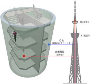 さらに塔内の地上200メートルの場所には地震の際 塔が揺れても柱(芯棒)が塔内部の壁に触れないようにオイルダンパー(クッション)が設置されています。