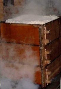 さらにその木箱を人の背丈ほどの高さに積み重ね床から立ち込める〃あつあつ〃の蒸気で40分ほど蒸します。