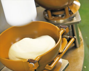 その米粉を幾つかの棒がついた〃かくはん機〃の中でお湯と一緒に練り込みます。すると今度はパサパサの雪の塊(かたまり)のような物が出来ます。
