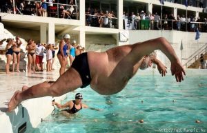 そして審判の笛に合図と共に巨漢男は重たいお尻を持ち上げながら思いっきり飛び込みました。それはまるで海に飛び込む象のようでした。
