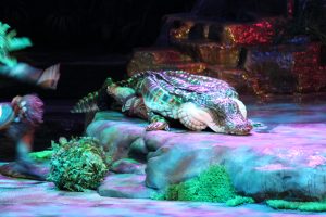 そしてそのショーは大迫力の太鼓の音と共に始まりました。するとステージに垂れ下がった太い緑の蔓(つる)が一本一本 天井に引き上げられて行きました。