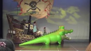 そして なんと巨大ワニは2本足で立ち上がりピーターパンのそばへと駆けよって来ました。そこへ少女ウェンディも加わり再び楽しいダンスショーが始まるのでした。