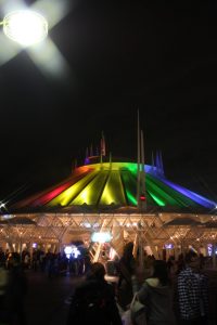 スペースマウンテンの屋根はクリスマスツリーのように虹色にライトアップされます。そして東京ディズニーランドではクリスマスに限らず毎日 夜8時半に花火が打ち上げられます。