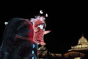 続いてやって来たのは様々な色に光り輝くキノコの森のようでした。しかしそれはキノコではなく鮮やかな色に光り輝くタージマハル宮殿(インド)でした。