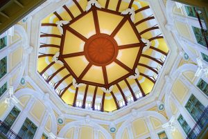 天井の中心部の一番高い所からは まるで花束が降ってきそうなほど綺麗な花飾りが彫られています。その八角形の花飾りの周りには8羽の(わし)がいます。