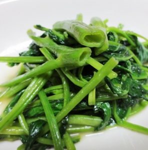 空を飛んでやって来た空芯菜(クウシンサイ)炒め 文字通り中は空洞のストロー状です。