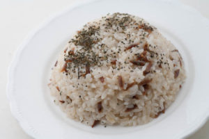 米と同じ量の水を入れ塩で味付け蓋をし20分炊く