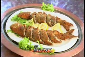 魚の皮の中に松の実やハーブ 魚の実を詰め込む オリーブ油でこんがりと焼く
