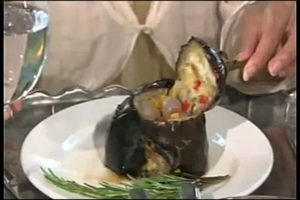 ナスの中身を取り出しその中に詰め物をし かまど で焼き上げる