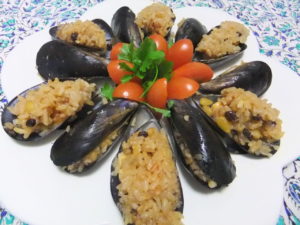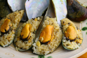 その上にご飯を詰めたムール貝を乗せる バットに少し水とオリーブオイルをたらす 塩コショウをする