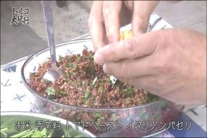 米とトマト パセリに塩コショウをし たっぷりのオリーブ油をかけ花に詰める 花を水で洗う花びらの中に具を詰める