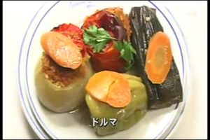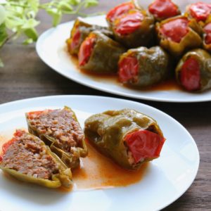 トマトやナスなどの野菜をくりぬき その中に細かく刻んだ野菜と米等を入れ煮込んだ料理