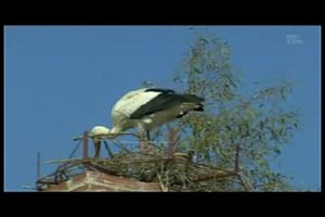 駅前にはローマ時代の柱が残る 柱の上ではコウノトリが巣を作る