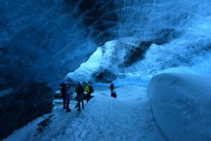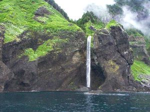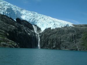 夏になると岸壁のように切り立った氷の塊から大滝が発生する 滝はそのまま海へと流れ落ちる