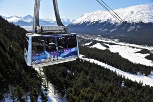 アラスカ鉄道 黄色と紺のごっつい列車 車内には天井がガラス張りの展望席がある